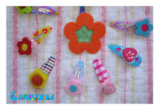 Sandra necesitaba también un regalín para las niñas de su comedor. Eran 14 de edades entre los 5 y los 11 añitos así que pensamos que lo mejor sería hacerles unas horquillas personalizadas y de estilos distintos: unas más infantiles, otras más cursis, otras más alegres, otras ya para mujercitas....