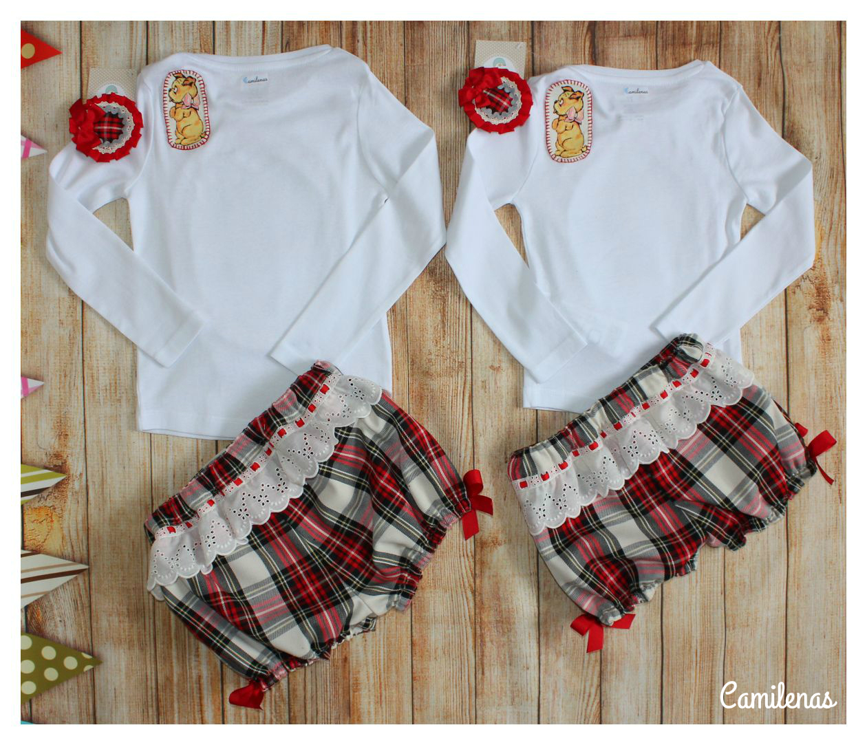 Para la niña camiseta de muñeca recortable con cuello de quita y pon de plumeti y cuadros., combinado con pantalón de volantes y tocadito a juego.