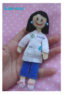 Aquí la podéis ver por detrás. La doble bata blanca con los detalles en verde ha sido porque me parecía sosete el fieltro blancoasí sin más y quise darle otro toque distinto al uniforme tradicional.